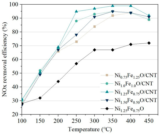 The catalytic activity of Fe-Ni oxide embedded in CNT was examined using the SCR reaction for the removal of nitrogen oxides. The nitrogen oxide removal efficiency was measured using a fixed-bed reactor. The nitrogen oxide removal efficiency was measured from 100 to 450 °C (intervals of 50 °C) after being maintained at each specific temperature for 1 h 30 m to stabilize the efficiency at each condition. Figure 7 shows the NOx conversion efficiency of Ni-Fe oxide embedded in CNT and Ni1.25Fe0.75O. Typical Fe oxide catalysts have low nitrogen oxide removal efficiency at temperatures below 350 °C as a single component [56,57]. The Ni-Fe oxide embedded in CNT exhibited enhanced efficiency over the entire temperature range compared to Ni-Fe oxide, which was reported to improve catalytic performance due to the increased active oxygen species generated by enhanced charge transfer between the oxide catalyst and CNT [58,59]. The nitrogen oxide removal efficiency of Ni1.25Fe0.75O/CNT improved by approximately 30% in the range of 200–250 °C compared with Ni1.25Fe0.75O. This indicates that the catalytic activity of Ni-Fe oxide embedded in CNT was increased by the formation of oxygen vacancies and active oxygen species since Ni2+ and Fe3+ were easily reduced by the enhanced charge transfer between Ni-Fe oxides and CNTs [55].