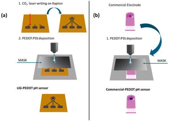 The schematic representation of the process workflows proposed: in (a), the workflow referring to the realization of the LIG-PEDOT pH sensor is sketched, while in (b), the one followed for fabricating the commercial-PEDOT pH sensor is represented.