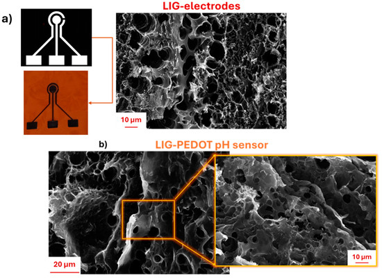 Furthermore, it was possible to appreciate a uniform deposition of PEDOT on LIG electrodes, preserving the interconnections among pores, thus favoring the mass electrolyte transfer into the active materials during electrochemical reactions, avoiding as much as possible the swelling and cracking of nanomaterials and simultaneously improving ionic conductivity. This latter consideration can positively affect the final pH sensitivity of LIG-PEDOT pH sensors.