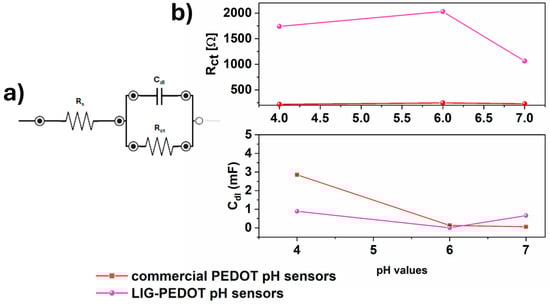 Moreover, it can be seen that both Rct and Cdl values of the LIG-PEDOT pH sensors showed greater variation among pH values with respect to the commercial PEDOT sensors, as reported in Figure 4b.