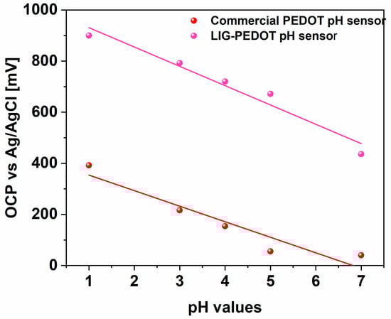 By analyzing Figure 5, it was possible to appreciate the linear Nernstian response of LIG-PEDOT pH sensors with a pH sensitivity close to (−75.6 ± 9.1) mV/pH, slightly better than the one achieved with commercial PEDOT pH sensors ((−60.8 ± 11.3) mV/pH).