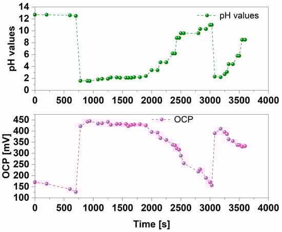A drastic drop in pH values, corresponding to the exposure to a strongly acidic environment (pH equal to 2), induced a sudden increase in measured OCP (reaching a value close to 450 mV).