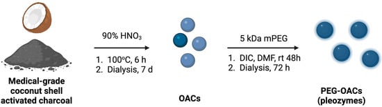 Schematic of PEG-OAC (pleozyme) synthesis. The synthesis starts by oxidizing a medicinal ingredient, coconut shell activated charcoal, with fuming nitric acid (90% HNO3) at 100 °C for 6 h in a round-bottom flash. The products are subsequently purified using water bath dialysis for 7 days and filtered through a 0.22 μm membrane to collect oxidized activated charcoal (OACs). Next, OACs are left to react with 5 kDa polyethylene glycol (PEG) in DIC and DMF for 48 h at room temperature. Subsequently, bath dialysis and filtration are performed to produce sterile PEG-OACs (pleozymes). Figure created using BioRender.
