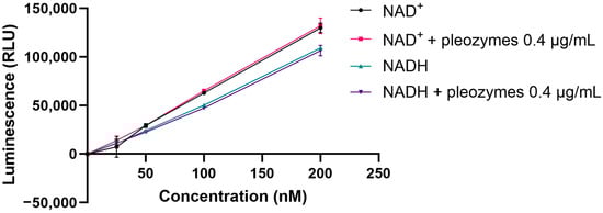 Pleozymes have no effect on NAD+- and NADH-associated luminescence. Briefly, 100 µM stocks of NAD+ and NADH are prepared in PBS and subsequently diluted in PBS to 200, 100, 50, and 25 nM NAD+ and NADH, separately, with and without 0.4 µg/mL pleozymes. The luminescence is recorded following the protocol provided with the NAD+/NADH Glo Assay (Promega). N = 1 experiment, each point represents the luminescence mean of two wells and its standard deviation (both directions).