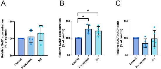 Cells were treated with nicotinamide riboside (NR) or pleozymes for 24 h, after which luminescence was measured. NR is a cell-permeable precursor for de novo NAD+ synthesis; therefore, a positive control for increasing intracellular NAD+ levels [10,30,31]. Notably, pleozyme treatment did not affect intracellular NAD+ levels but, instead led to an unexpected increase in NADH and a decrease in the NAD+/NADH ratio (Figure 2A–C). Treatment with NR resulted in a modest increase in NAD+, a significant increase in NADH, and a trend towards decreased NAD+/NADH ratios (Figure 2A–C). This was an unexpected outcome, as we anticipated that a NAD+ donor would primarily raise the NAD+ levels. The results of NR and pleozyme treatments suggest that the production and subsequent cellular consumption of NAD+ potentially activates several spontaneous NAD+-dependent reactions, generating NADH as a byproduct.