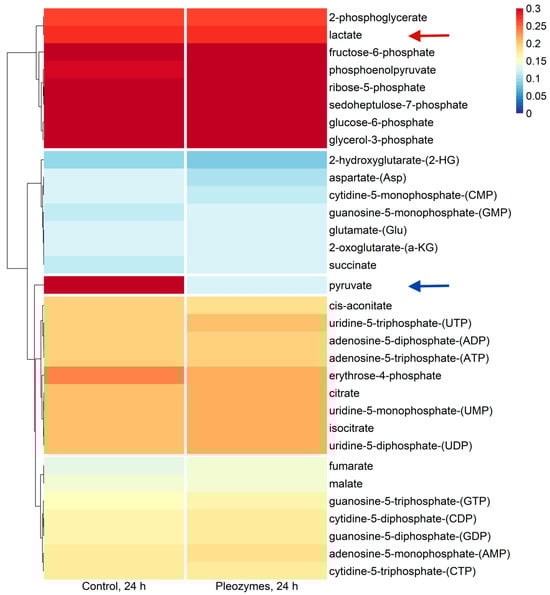 Pleozyme treatment of glycolytically active bEnd.3 murine endothelial cells decreased isotopic enrichment of pyruvate. Columns show metabolite enrichment values from phosphate buffered saline- (control) and pleozyme-treated bEnd.3 cells. Colors represent isotopic enrichment of each metabolite, computed from 13C tracing mass spectrometric metabolic flux analysis. Colors are scaled linearly, with higher and lower enrichment values represented by redder and bluer shades, respectively. Basally elevated isotopic enrichment of glycolytic metabolites suggests a higher rate of generation (i.e., increased glycolytic flux). Decreased pyruvate enrichment (blue arrow) in the context of increased glycolytic flux suggests hypothetically increased downstream metabolism of pyruvate with pleozyme treatment. Lactate enrichment (red arrow) remained unaffected with pleozymes. Dendrogram indicates hierarchical clusters of metabolites with similar expression patterns, generated using Ward’s algorithm. N = 1 experiment.