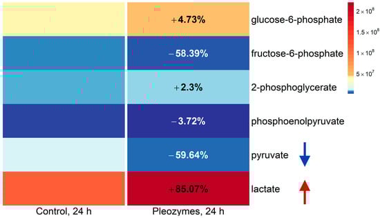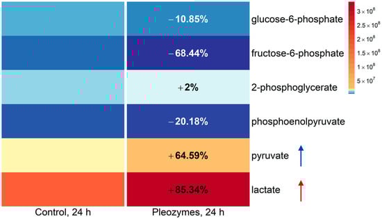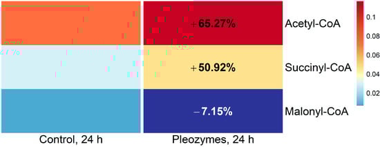 Levels of acetyl-CoA and succinyl-CoA increased 65% and 50% with pleozyme treatment, respectively (Figure 9). Notably, pleozymes had a different effect on malonyl-CoA, decreasing levels by 7%. Fatty acid β-oxidation releases acetyl-CoA and succinyl-CoA, while malonyl-CoA inhibits this process and stimulates fatty acid synthesis [6,7,35,36]. These results suggest that pleozymes initiate fatty acid oxidation, leading to the accumulation of the catabolites acetyl-CoA and succinyl-CoA (Figure 9).