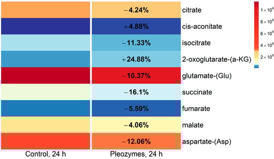 Pleozyme treatment of bEnd.3 cells decreased abundances of TCA cycle intermediates, glutamate, and aspartate, while increasing levels of 2-oxoglutarate. Colors represent mean DNA-normalized mass spectrometric abundances of M + 0 unlabeled TCA cycle intermediates and the amino acids glutamate and aspartate at baseline (“Control, 24 h”) and following pleozyme treatment. A trend, albeit relatively small of decreased TCA metabolite abundances including citrate, isocitrate, succinate, fumarate, and malate may suggest that pleozyme treatment induces the diversion of TCA cycle intermediates toward other biosynthetic pathways. Decreased abundance of glutamate may correspond with an increase abundance of 2-oxoglutarate entering the TCA cycle, which, together with a decreased abundance of aspartate, may indicate increased replenishment of TCA cycle intermediates (anaplerosis) through amino acid transamination. Colors scaled following quantile binning, with an equal number of data points per bin. N = 1 experiment.