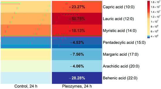 Pleozyme treatment showed an increase in the levels of medium-chain and long-chain fatty acids (MCFAs and LCFAs), such as capric acid (C10:0), lauric acid (C12:0), and myristic acid (C14:0). A small reduction in the levels of very long-chain fatty acids (VLCFAs), such as pentadecyclic acid (C15:0), margaric acid (C17:0), arachidic acid (C20:0), and behenic acid (C22:0), was also observed (Figure 8). The results suggested that pleozymes potentially stimulated the breakdown of VLCFAs to LCFAs and subsequently metabolized into MCFAs, generating acetyl-CoA, succinyl-CoA (Figure 9), and NADH (Figure 2) in the process.
