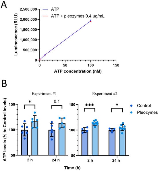 Pleozymes increase intracellular ATP levels after 2 and 24 h of treatment. bEnd.3 murine brain endothelial cells are treated with pleozymes for 2 and 24 h. Then, cell lysate is collected, and ATP levels are measured using a luciferase-coupled luminescence assay. (A) Pleozymes at a hypothetical intracellular level of 0.4 µg/mL do not affect ATP-associated luminescence. N = 1 experiment, points represent the mean luminescence of two technical replicates and its standard deviation (ATP in blue, top direction and ATP+pleozymes in red, bottom direction). (B) Pleozyme treatment trends toward an increase in intracellular ATP levels at both treatment durations, and this trend is statistically significant at 2 h in two independent assays and at 24 h in one assay. N = 4–8 technical replicates, mean ± standard deviation (both directions), Student’s t test, * represents p < 0.05, *** represents p < 0.001.