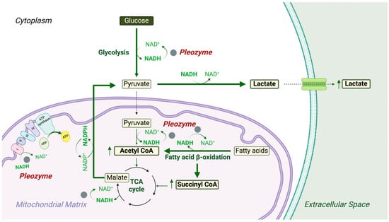 Pleozymes enhance intracellular and mitochondrial energetic pathways and catalytically supply metabolic reactions with NAD+ regeneration activities. Localizing in the cytoplasm and mitochondria, pleozymes catalytically accelerate NAD+ regeneration from NADH and subsequent ATP production, leading to an increase in the NAD±-dependent metabolic rates. Pleozymes accelerate intracellular energy metabolisms through glycolysis and lactate generation. Pleozyme treatment also increases fatty acid β-oxidation and supplies acetyl- and succinyl-CoA to the TCA cycle, driving the cycling reactions and replenishing the lactate precursor, pyruvate, from malate. Figure created using BioRender (https://BioRender.com/d80a234, accessed on 29 November 2024).