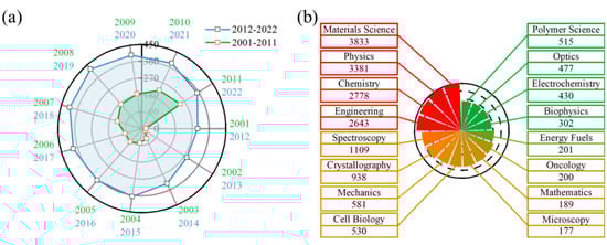 Evolution of interest in ND research: (a) Annual growth rate of publications related to “ND”. (b) Total number of publications on “ND” across various scientific disciplines.
