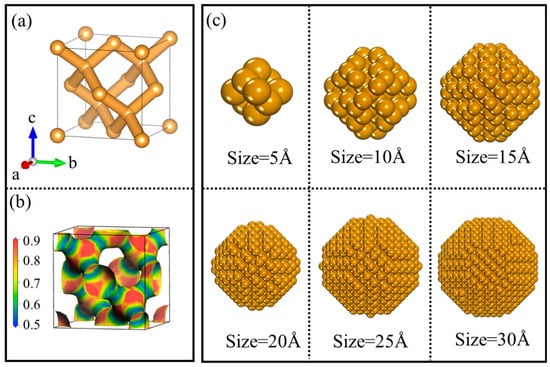 Crystal structure, charge distribution, and particle models of diamond: (a) Schematic of the crystal structure of NDs. (b) Charge distribution of NDs. (c) Models of ND particles with diameters of 5 Å, 10 Å, 15 Å, 20 Å, 25 Å, and 30 Å.