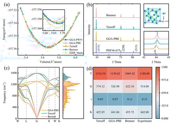 Validation of the interatomic potential of diamond: (a) E–V curve. (b) XRD spectrum. (c) Phonon dispersion curves and phonon density of states. (d) Mechanical properties.