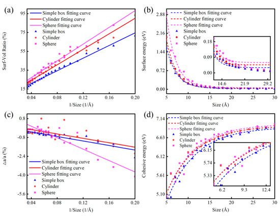 It is well known that as particle size decreases to the nanoscale, the surface area-to-volume ratio significantly increases []. At the nanoscale, many properties, such as catalytic activity and optical characteristics, undergo notable changes due to the high proportion of surface atoms []. To assess the surface atom proportion of the ND particles, we manually counted the atoms exposed on the surface. Figure 4a illustrates the proportion of surface atoms for NDs of varying sizes and shapes, calculated using the Tersoff potential. All these ND particles exhibit a similar trend: the proportion of surface atoms increases as the particle size decreases. We also observed that, within the nanoscale range, particle shape plays a crucial role: at the same size, spherical particles have the highest proportion of surface atoms, while simple cubic particles have the lowest. Furthermore, within the range of 5 to 20 Å, the size and shape of the particles have a significant impact on their properties. As the particle size increases to 25 to 30 Å, the proportion of surface atoms gradually approaches 20%, which indicates that the surface atom ratio stabilizes and is gradually no longer significantly affected by changes in particle size or shape.