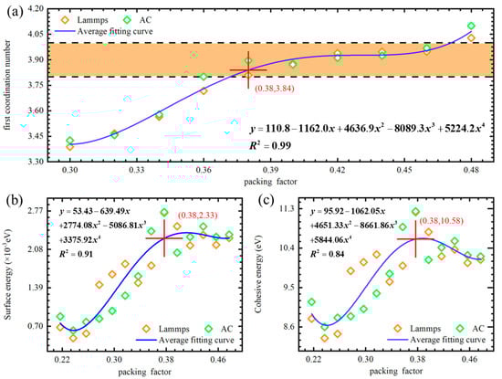 To validate this hypothesis, it is necessary to calculate the properties of amorphous metals. Due to the lack of long-range order, the surface energy of amorphous materials is typically higher. This higher surface energy can result in increased reactivity, affecting the stability and chemical behavior of the material. The relationship between the surface energy of the amorphous ND structure (in units of 10−3 eV) and the packing coefficient is shown in Figure 6b. The orange symbols represent results obtained from Lammps modeling followed by quenching and GULP structural optimization. The green symbols represent results from AC modeling combined with Lammps quenching and GULP optimization. The red crosses indicate the point where the surface energy change begins to level off. The blue solid line represents the average surface energy obtained from both Lammps and AC modeling. As shown in Figure 6b, the surface energy exhibits a plateau across different modeling approaches, leveling off at a packing coefficient of 0.38. The corresponding fitted equation is as follows: