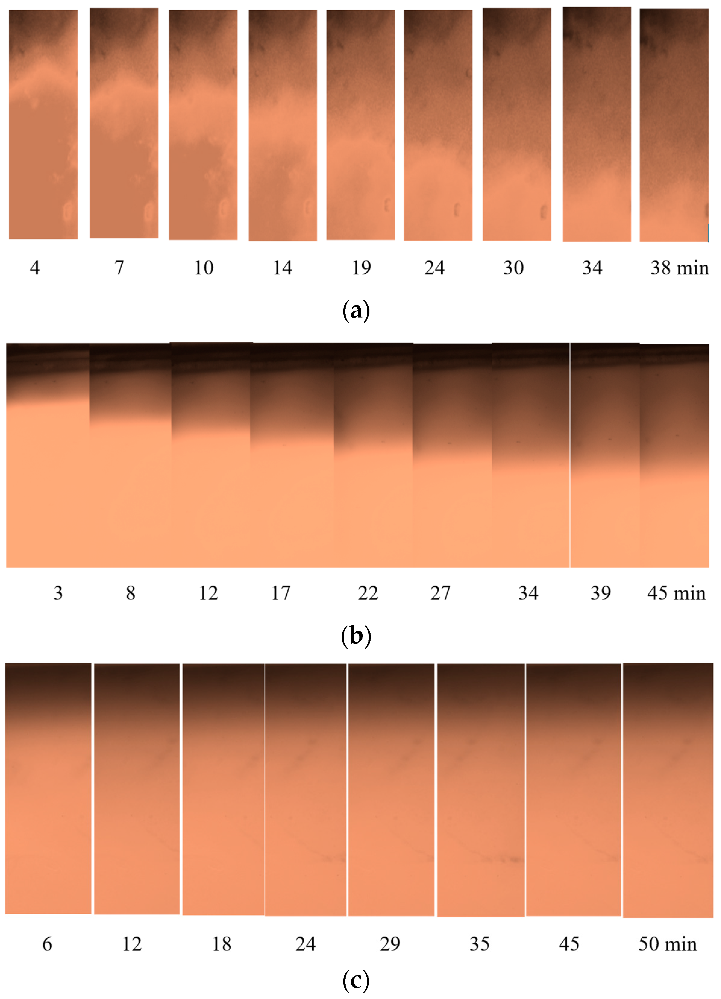 Magnetically controlled fronts of CD-SPIONs (r = 95 nm (a), 220 nm (b), 350 nm (c)) in agar gel of 350–400 nm mean pore size, under 40 T/m gradient of MF in microfluidic chip.