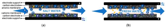 - Porada, S.; Zhao, R.; van der Wal, A.; Presser, V.; Biesheuvel, P.M. Review on the science and technology of water desalination by capacitive deionization. Prog. Mater. Sci. 2013, 58, 1388–1442. [Google Scholar] [CrossRef]