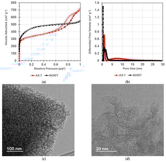 (a) N2 adsorption–desorption isotherms of the active materials used in the electrodes; (b) Pore size distribution obtained from 2D-NLDFT Heterogeneous Surface model; (c,d) HRTEM of AX-7 synthetic material evaluated in this work.