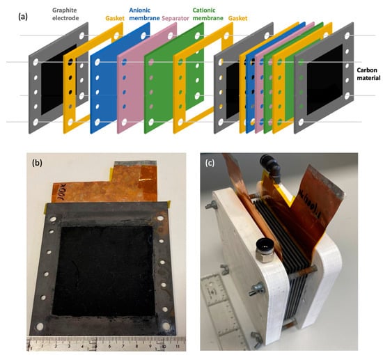 (a) Schematic representation of the CAPMIX cell, illustrating the arrangement of components. (b) Carbon-based electrodes for the CAPMIX cell and (c) cell stack assembly.