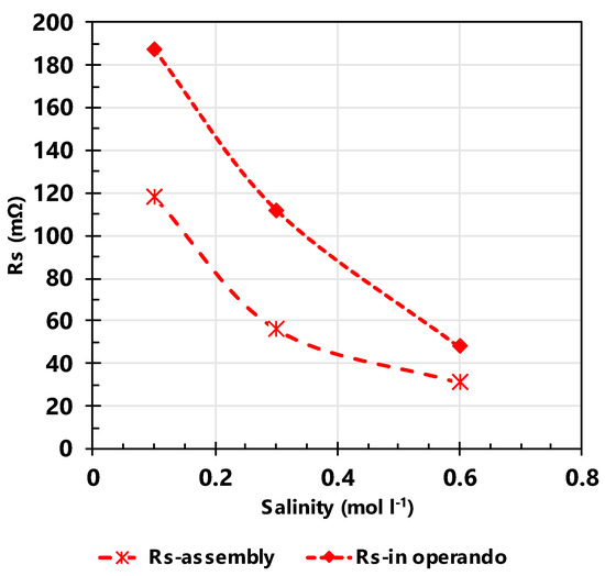 Series resistance (Rs) of the cell as a function of salinity of the water without and within operation (constant flow of 240 cm3 min−1), using electrodes of 300 μm with AX-7 as active material.