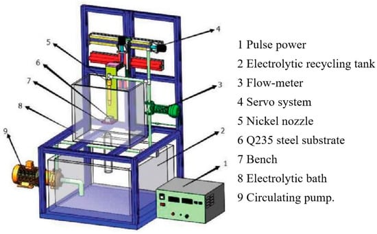 Compared to traditional electrodeposition, the jet pulse electrodeposition (JPE) technique using a circular electrolyte sprayed and deposited onto a substrate surface could improve the microstructure, corrosion resistance, and wear resistance of the coatings [9]. Therefore, JPE offers significant advantages, including a high efficiency, broad adaptability, and cost-effectiveness, making it the preferred choice for metal matrix coatings [10,11]. For instance, Fan et al. [12] prepared a nano-crystalline copper electrode material on a stainless steel substrate. Zhao et al. [13] studied the influence of pulse parameters on the microstructure and anti-corrosion performance of Cu/Al2O3 composites. The influence of various surfactant types on the structure and anti-corrosion property of electrodeposited Cu/TiO2 composites was examined by Ning et al. [14].