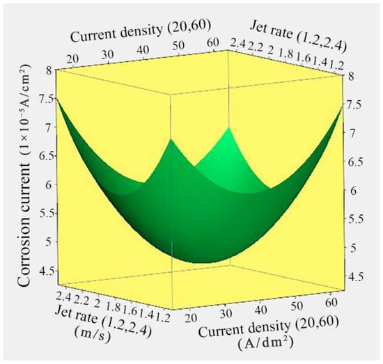 Figure 2 depicts the response surface relationship between the corrosion current of Ni/TiN composites and the current density and jet rate. The lowest corrosion current observed in Ni/TiN composites was 4.68 × 10−5 A/cm2, achieved at a jet rate of 1.81 m/s and a current density of 39.85 A/dm2. Moreover, with increasing current density and jet rate, the corrosion current of Ni/TiN composites showed an initial decrease and then a subsequent increase. The following factors may provide explanations for these results: (1) the increase in current density generated large cathode polarization and promoted the co-deposition of TiN particles and Ni2+ ions, leading to the grain size being refined, an increase in the TiN content, and a decrease in the corrosion current of Ni/TiN composites [24]. However, the substantial current density triggered considerable hydrogen evolution and concentration polarization, ultimately resulting in the development of surface defects in the coatings, including pits and fractures. Hence, the corrosion current of Ni/TiN composites increased [25]. Furthermore, the high current density formed an uneven and coarse surface, resulting in an increase in the corrosion current of Ni/TiN composites. (2) The increase in jet rate could move a larger amount of TiN particles to the cathode, which improved the content of TiN particles in the Ni/TiN composites [26]. Alternatively, an appropriate jet rate could reduce the thickness of the diffusion layer and inhibit the rapid growth of the nickel grain, leading to the formation of a dense and flatted microstructure and a reduction in the corrosion current [27]. These results are consistent with the research of Zhang et al. [28], who reported on the effect of current density and jet rate on the corrosion resistance of NMCs.