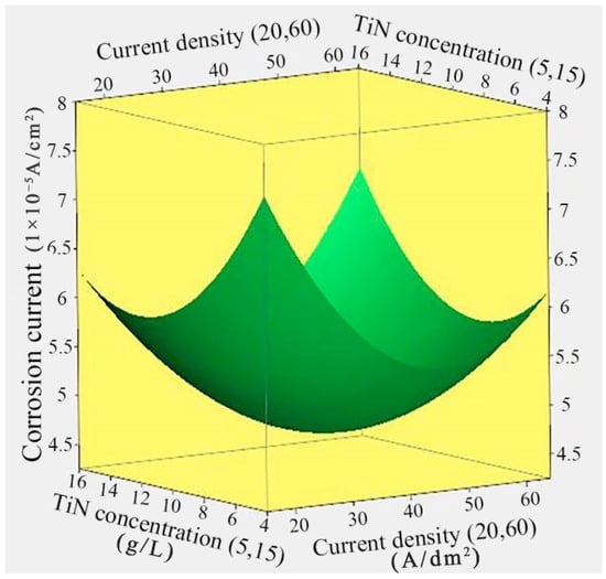 Figure 3 displays the response surface relationship between the corrosion current of Ni/TiN composites and the current density and TiN concentration. The lowest corrosion current for Ni/TiN composites (4.69 × 10−5 A/cm2) was achieved at a current density of 39.96 A/dm2 and a TiN concentration of 10.57 g/L. Furthermore, as both the TiN concentration and current density increased, the corrosion current of Ni/TiN composites initially decreased and subsequently increased. These results can be attributed to the same factors previously discussed regarding the influence of current density on the corrosion current of Ni/TiN composites. Furthermore, the insufficient TiN concentration could not provide enough nucleation points, and it limits the rapid growth of Ni grains. Therefore, this led to the development of a coarse and uneven structure and the generation of a high corrosion current in the Ni/TiN composites [29]. However, higher concentrations of TiN contributed to significant concentration polarization and a high viscosity of the electrolyte, leading to the coarse and uneven microstructure generated. The finding is proven by the conclusion of Liu et al. [30], who reported on the effect of TiN concentration on the microstructure of Ni-W/TiN coatings. These factors hindered TiN particles embedded into the nickel matrix and showed a pronounced increase in the corrosion current of Ni/TiN composites. The conclusion is similar to the research conducted by Li et al. [31] regarding the influence of reinforced phase particles on the anti-corrosion ability of Ni/BN/TiC layers.