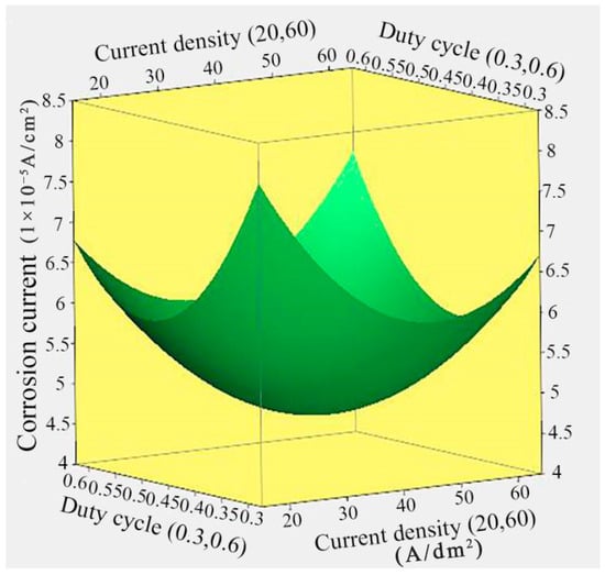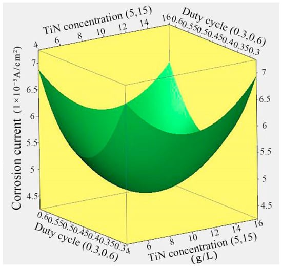 Figure 4 illustrates the response surface relationship between the corrosion current of Ni/TiN composites and the duty cycle and current density. Achieving the minimum corrosion current of 4.7 × 10−5 A/cm2 for Ni/TiN composites required a current density of 41.26 A/dm2 and a duty cycle of 0.45. Furthermore, as both the duty cycle and current density increased, the corrosion current of Ni/TiN composites initially decreased and then increased. Similar to the previous analysis, the reasons for the observed result can be attributed to the following: (1) the corrosion current of Ni/TiN composites can be affected by the current density, as previously explained. (2) The duty cycle had a significant effect on the structure and corrosion resistance of NMCs, according to Yu et al. [32]. The prolonged duration of the pulse interval caused by the low duty cycle was detrimental to TiN particles embedded into the nickel matrix and the formation of a compact and smooth structure, which reduced the anti-corrosion ability of the composites in contact with the corrosion liquid and increased the corrosion current of Ni/TiN composites [33]. (3) However, the higher duty cycle resulted in the growth of the average current density and produced a significant hydrogen evolution, which eventually decreased the anti-corrosion performance and increased the corrosion current of the Ni/TiN composites [34].