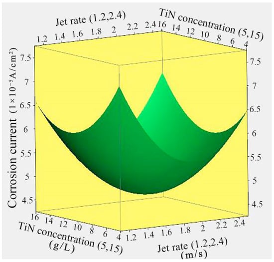 Figure 5 illustrates the response surface relationship between the corrosion current of Ni/TiN composites and the jet rate and TiN concentration. The lowest corrosion current of 4.68 × 10−5 A/cm2 for the Ni/TiN composites was achieved at a jet rate of 1.86 m/s and a TiN concentration of 10.49 g/L. As the jet rate and TiN concentration increased, the corrosion current of the Ni/TiN composites showed an initial decrease followed by a subsequent increase. The same reasons for the influence of jet rate and TiN concentration on the corrosion current of the Ni/TiN composites are discussed in the previous chapter.