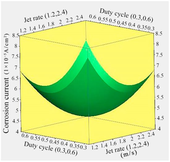 Figure 6 shows the response surface relationship between the corrosion current of Ni/TiN composites and jet rate and duty cycle. The lowest corrosion current of 4.67 × 10−5 A/cm2 for Ni/TiN composites was achieved at a jet rate of 1.85 m/s and a duty cycle of 0.45. Moreover, the corrosion current of Ni/TiN composites initially decreased and then increased with an increase in both the jet rate and duty cycle. The same reasons for the effect of the jet rate and duty cycle on the corrosion current of the Ni/TiN composites are discussed in detail in Section 3.1 and Section 3.3.