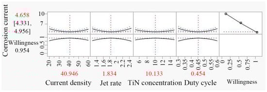 The operational parameters of Ni/TiN composites were optimized using the least square method to minimize the propensity of corrosion current to achieve the highest-possibility corrosion resistance. The pulse parameters were rounded to two decimal places to facilitate the experimental operation. The optimized conditions for minimizing corrosion current in Ni/TiN composites are depicted in Figure 8. These conditions include the following: a current density of 40.95 A/dm2, a jet rate of 1.83 m/s, a TiN concentration of 10.13 g/L, and a duty cycle of 0.45.