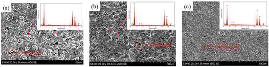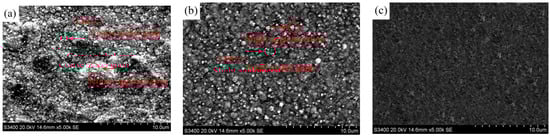 For contrast, the Ni/TiN composites produced at a current density of 20 A/dm2, jet rate of 1.2 m/s, TiN concentration of 5 g/L, and duty cycle of 0.3 are denoted as JPE-1. The Ni/TiN obtained at a current density of 40 A/dm2, jet rate of 1.8 m/s, TiN concentration of 10 g/L, and duty cycle of 0.45 are recorded as JPE-2. The Ni/TiN composites prepared at a current density of 40.95 A/dm2, jet rate of 1.83 m/s, TiN concentration of 10.13 g/L, and duty cycle of 0.45 are regarded as JPE-3. Scanning electron micrographs of the surface morphological characteristics of Ni/TiN composites are illustrated in Figure 9. The element compositions and contents of Ni/TiN composites are displayed in Table 5. Xia et al. [36] reported that the plating parameters had a significant influence on the surface morphology of NCBs. The SEM analysis revealed that the optimization of the plating parameters significantly enhanced the nickel grain size and surface uniformity of the Ni/TiN composite coatings. A considerable aggregation of TiN nanoparticles and coarse nickel particles was observed in JPE-1, while JPE-2 showed only a slight aggregation of TiN nanoparticles and small nickel grains. However, refined nickel grains and a dense, flatted microstructure were observed in JPE-3. Furthermore, the EDS results indicated that the Ti content of JPE-3 (12.95 wt.%) was significantly higher than that of JPE-1 (4.26 wt.%) and JPE-2 (10.74 wt.%). The observed result can be ascribed to the abundance of TiN particles, which significantly enhance the refinement strength of nickel grains [37]. This conclusion aligns with the research findings obtained by Fan et al. [38], who reported on the effect of operational parameters on the microstructure of NMCs obtained via an electrodeposition technique.