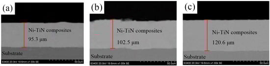 Figure 10 shows the cross-sectional surface of Ni/TiN composites. The SEM pictures indicate the increase in the thickness of Ni/TiN composites after varying the process parameters at the same electrodeposition time. The thickness of JPE-1, JPE-2, and JPE-3 samples was determined to be 95.3, 102.5, and 120.6 μm, respectively. The deposition speed (s) can be calculated according to the following equation: