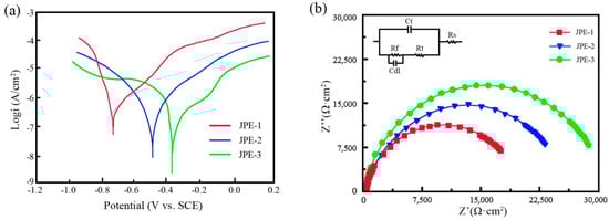 Figure 12 shows the polarization curves and Nyquist plots of Ni/TiN composites. The specific data is listed in Table 7. According to Li et al. [41], coatings with low corrosion current, high corrosion potential, and large corrosion impedance were found to have superior corrosion resistance. The extrapolation method showed that corrosion potentials (Ecorr) of JPE-1 and JPE-2 were determined to be −0.762 V and −0.441 V, respectively, as shown in Figure 12a. In contrast, JPE-3 had the highest corrosion potential, with the value of −0.384 V. Furthermore, the corrosion currents (Icorr) of JPE-1 (9.52 × 10−5 A/cm2) and JPE-2 (4.71 × 10−5 A/cm2) were higher than that of JPE-3 (4.63 × 10−5 A/cm2). JPE-3 had a higher impedance value compared to JPE-1 and JPE-2, as demonstrated in Figure 12b. Hence, these findings indicate the significantly superior corrosion resistance of JPE-3 compared with JPE-1 and JPE-2.