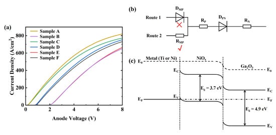 (a) Forward I–V characteristics of the six types of devices examined. (b) Possible conduction mechanisms for the metal-NiOx-Ga2O3 system. (c) Schematic energy band diagram of PNDs.