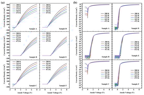 The temperature-dependent I–V curves of these samples are shown in Figure 4 and Figure 5. Figure 4a,b present the I–V curves of the devices under linear and semi-logarithmic scales, respectively. Figure 5a,b provides the variation in current density (at 8 V) and Von as the temperature increased for the six types of samples. For each type of sample, at least three devices were tested, and they provided similar results. Considering the uniformity and consistency of the devices, only a subset of curves and data is presented. According to the thermionic emission (TE) theory [27,28], when a device current approaches saturation, the current density is negatively correlated with temperature. Clearly, all samples exhibited this characteristic. The results indicated that sample A had the highest current density, which is attributed to the presence of only a Schottky junction and a low work function metal. Due to the bandgap narrowing effect [29] and thermally enhanced carrier diffusion [30], the Von of all samples decreased to varying degrees as the external temperature increased. The Von of the two PNDs was almost identical, but the current density at 8 V differed, consistent with previous results. Additionally, for the same anode metal, the turn-on voltage of the JBSDs was slightly higher than that of the SBDs. When the external temperature was set to 473 K, the Von of samples A and C approached zero.