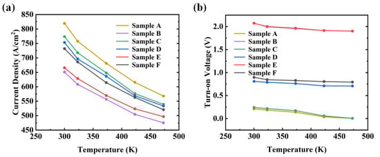 (a) Current density curves of the six types of devices. (b) Turn-on voltage curves of the six types of devices.
