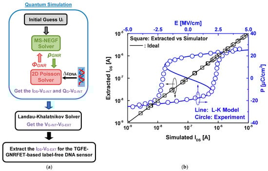 Figure 2a illustrates the essential computational procedures required to simulate the TG-MFM GNRFET-based label DNA sensor. The flowchart comprises two primary computational blocks. The first block focuses on quantum mechanically simulating the baseline (without ferroelectric) top-gated GNRFET. This involves solving the Poisson equation, wherein DNA information is incorporated through the cavity dielectric constant, and employing the mode space NEGF self-consistently until convergence [49,50,51], as depicted in the quantum simulation block. The output of this convergence enables the extraction of drain current and gate charge as a function of the internal metal gate voltage.