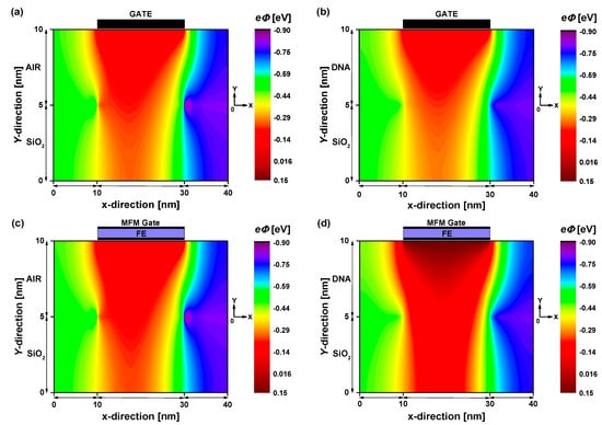 Two-dimensional electron potential distribution at VDS = 0.3 V and VGS = 0.1 V for baseline TG GNRFET-based biosensor (top figures) and TG-MFM GNRFET-based biosensor (bottom figures). (a,c) Empty open cavity. (b,d) Cavity filled with DNA molecules.