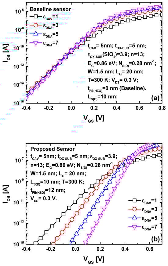 The IDS-VGS characteristics for (a) the baseline and (b) the proposed biosensor considering different DNA dielectric constants.