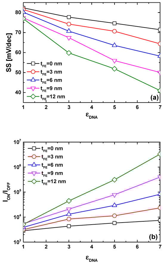 Figure 6a illustrates the behavior of subthreshold swing versus DNA dielectric constant for the proposed biosensor considering different ferroelectric thicknesses. By definition, the subthreshold swing can be seen as the required gate voltage to change the drain current by about one order of magnitude [60,61,62]. It is evident that the subthreshold swing decreases with an increase in the DNA dielectric constant, as observed in Figure 5b. Notably, an increase in ferroelectric thickness enables the attainment of steeper subthreshold swing values, making subthermionic subthreshold swing achievable. This outcome is anticipated due to the FE-induced gate voltage amplification, which accelerates the device switching [63,64,65]. To comprehensively capture the collective effects of DNA dielectric constant increment on transfer characteristics (i.e., ION increasing, IOFF decreasing, SS lowering), we employ the ION/IOFF current ratio as a sensing metric while considering the power supply voltage (VDD) equal to the drain-to-source voltage [66,67,68]. Our choice of this metric is grounded in its sensitivity to changes in on-current, off-current, and subthreshold swing. In our case, all recorded trends (i.e., ION increasing, IOFF decreasing, SS lowering) contribute to an increase in the current ratio, rendering it an innovative sensing metric. Figure 6b demonstrates that the current ratio increases with an increase in DNA dielectric constant, aligning with the recorded trends of ION increasing, IOFF decreasing, and SS decreasing under εDNA increment. It is noteworthy that biosensors with a thicker ferroelectric layer exhibit higher sensitivity compared to those endowed with thin FE material, thereby rendering DNA events (e.g., ssDNA density, DNA hybridization, dsDNA concentration, etc.) more distinguishable, as clearly shown in the same figure.