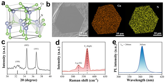 Structure and characterization of GaN nanoplates. (a) Wurtzite structure of GaN. (b) SEM and EDS mapping images of GaN nanoplate. (c) XRD image of GaN. (d,e) Raman (d) and PL (e) spectra of GaN, excited by 532 nm and 266 nm, respectively.