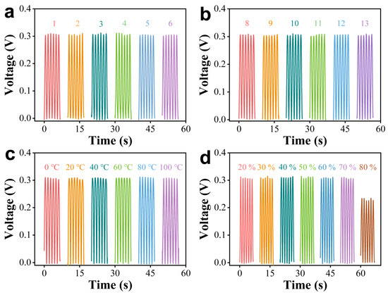 Output voltage of GaN sensors under various conditions: (a) pH from 1 to 6, (b) pH from 8 to 13, (c) temperature from 0 °C to 100 °C, and (d) relative humidity from 20% to 80%.