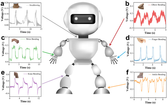 The exceptional and stable electrical performance indicates the capability of detecting the motion of human joints. The flexible sensor was placed on various joints to monitor human activity. It was positioned on the throat (Figure 5a), elbow (Figure 5b), wrist (Figure 5c), finger (Figure 5d), knee (Figure 5e), and ankle (Figure 5f) to monitor the bending motions (Video S1). The sensor effectively captured physiological signals, from subtle to substantial variations, with consistent voltage recorded across different areas of human body. These results indicate that the application of the sensor to the human body is feasible.