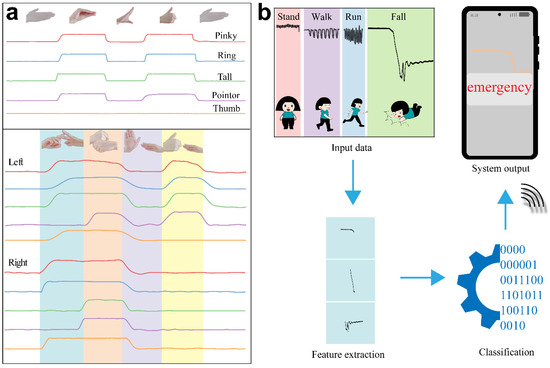 (a) The response of GaN flexible sensor on different fingers to sign language “Good morning” and “Wishing you success at work”. (b) Smart system of fall warning for elders based on GaN sensors.
