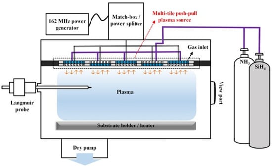 - Kim, K.S.; Kim, K.H.; Ji, Y.J.; Park, J.W.; Shin, J.H.; Ellingboe, A.R.; Yeom, G.Y. Silicon nitride deposition for flexible organic electronic devices by VHF (162 MHz)-PECVD Using a Multi-Tile Push-Pull Plasma Source. Sci. Rep. 2017, 7, 13585. [Google Scholar] [CrossRef] [PubMed]
