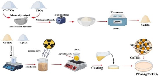 - Abdel Maksoud, M.I.A.; Abdelhaleem, S.; Tawfik, E.K.; Awed, A.S. Gamma radiation-induced synthesis of novel PVA/Ag/CaTiO3 nanocomposite film for flexible optoelectronics. Sci. Rep. 2023, 13, 12385. [Google Scholar] [CrossRef]
