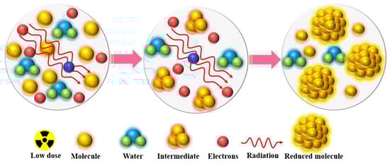 | Dose rate | Low (10 kGy/h) | High (3 kGy) | Metallic Nanoparticles | Radiolytic reduction of HauCl4 in solution | Direct reduction of AgNO3 in solution | [59,72,134] |