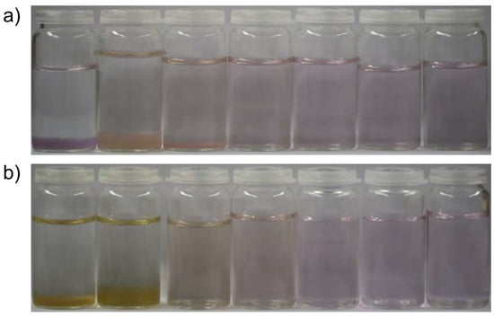 Photographs of samples obtained by mixing equal volumes of 10 mM solutions of CoCl2 and (NH4)2CO3, with the latter containing different amounts of dissolved sodium silicate (from left to right): 0, 100, 300, 700, 1000, 1500, and 2000 ppm SiO2. The pH was adjusted to (a) 9.0 and (b) 11.0 after mixing with the addition of HCl and NaOH.
